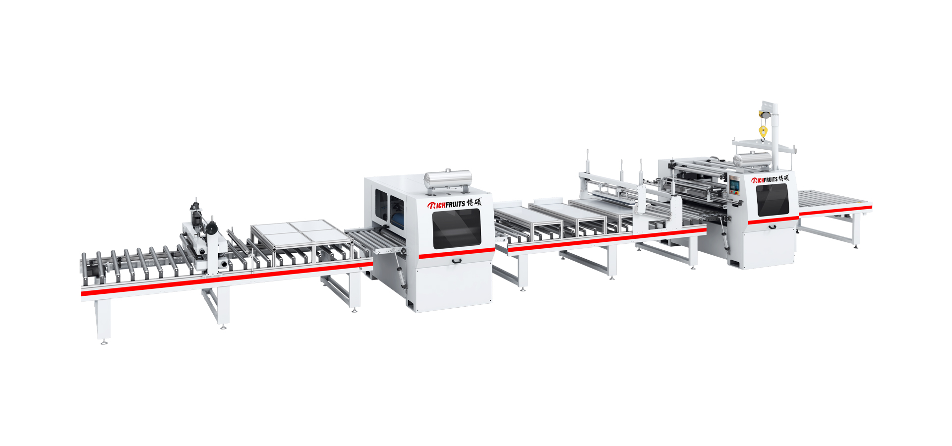 本生產(chǎn)線由:粉塵清除機 — PUR涂膠機(含溶膠系統(tǒng)) — 恒溫隧道 — 平貼機 — 輸送機等部分組成。