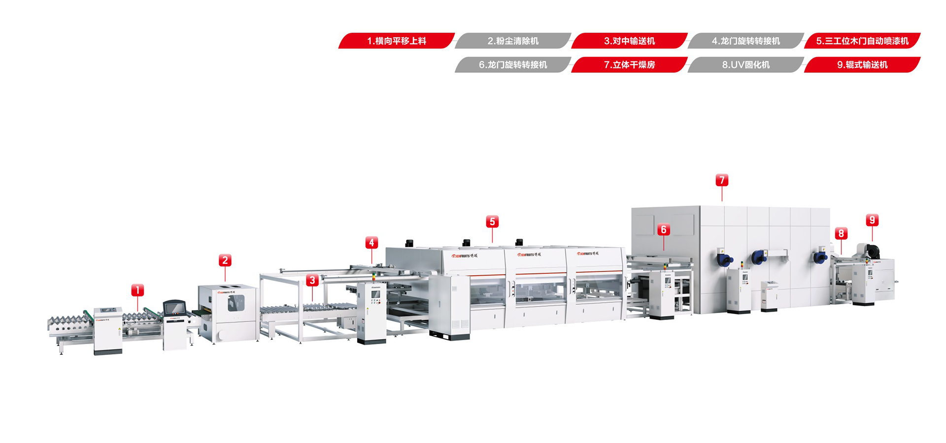 適用于板式家具、實木門、櫥柜門、工藝品、裝飾板、硅酸鈣板、玻鎂板、水泥纖維板的板式加工件的平面和四個側(cè)邊進行高質(zhì)量、大批量連續(xù)噴漆。
