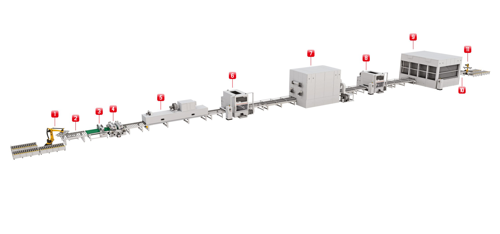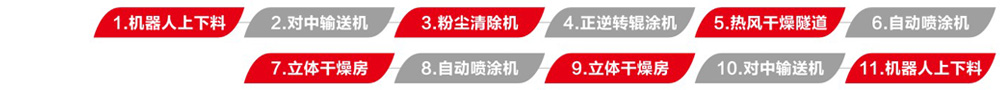 預(yù)輥實色水性中涂,再通過兩次水包水薄噴待干的工藝配合,一來將色差降至最低,二來避免底層漆膜水份透不來形成假干的現(xiàn)象。后段配平鋪式立體干燥房,避免了厚噴漆膜流掛的現(xiàn)象,同時實現(xiàn)油漆快速干燥,將能耗降至最優(yōu)。