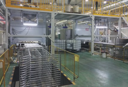 產(chǎn)品種類(lèi) 外墻保溫裝飾一體板(水包水多彩漆、真石漆、水包砂) 產(chǎn)線數(shù)量 基板處理生產(chǎn)線1條、自動(dòng)噴涂線1條 設(shè)備特色 整線自動(dòng)化,從進(jìn)板到出板一次性完成。 生產(chǎn)產(chǎn)能 水包水多彩漆、真石漆、水包砂65萬(wàn)平方米 油漆干燥方式 連線豎式折葉干燥隧道 生產(chǎn)人員數(shù)量 18人 廢氣廢水處理 光氧處理、水過(guò)濾循環(huán)處理 -