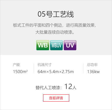 工藝要求 無(wú)溶劑uv底漆、水性面漆 產(chǎn)品種類 木門、門套、線條 產(chǎn)線數(shù)量 6條 設(shè)備特色 水性色漆的高質(zhì)量噴涂 生產(chǎn)產(chǎn)能 色漆噴涂線:400套門/8h (生產(chǎn)員3人/線)