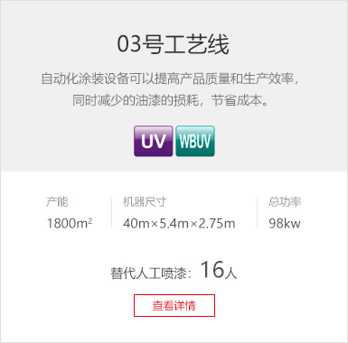 工藝要求 UV底漆、UV面漆 產(chǎn)品種類 衛(wèi)浴柜 產(chǎn)線數(shù)量 18條 設備特色 底面工藝均采用UV漆工藝。 生產(chǎn)產(chǎn)能 UV底漆線:1500m2/8h (生產(chǎn)員4人/線)