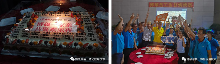 書寫每個壽星名字的生日蛋糕,是博碩涂裝對壽星們的真誠祝福和深深關愛,伴隨著生日歌,大家一起吹滅蠟燭許下愿望,全體分享蛋糕,為壽星們送上真誠的祝福。