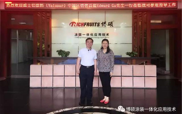 博碩公司由謝總和技術(shù)應(yīng)用的胡博士、市場(chǎng)部的吳總接待士伯涂料(Valspar)中國(guó)區(qū)銷售總監(jiān)Edward Gu先生。雙方針對(duì)現(xiàn)在市場(chǎng)上的涂料與涂裝設(shè)備應(yīng)用和未來涂料和涂裝設(shè)備的產(chǎn)業(yè)方向進(jìn)行深入的探討,各抒己見,同時(shí)對(duì)未來水性涂料和涂裝設(shè)備的對(duì)接提出了前曕性的思路。提出了現(xiàn)階段由涂裝設(shè)備牽頭完成的自動(dòng)化和環(huán)?;漠a(chǎn)業(yè)升級(jí)改造。未來是有涂料前沿技術(shù)的創(chuàng)新和發(fā)展驅(qū)動(dòng)整個(gè)涂裝產(chǎn)業(yè)的發(fā)展方向。