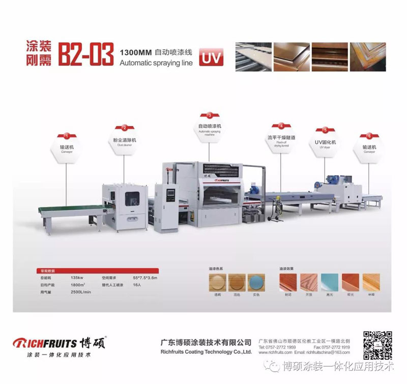 本次展會博碩攜涂裝剛需:B2-03亮相展位,它具有高效、節(jié)能、環(huán)保的特點,采用UV底+水性面或UV底+UV面的自動化噴涂工藝,達到環(huán)保的效果;一條線的管理只需3人,代替16名操作工人;油漆回收利用率達80%—85%,是傳統(tǒng)手工噴涂的兩倍;適用于櫥柜、木門、實木、整木等家居領(lǐng)域,日均產(chǎn)能高達1800平方米。
