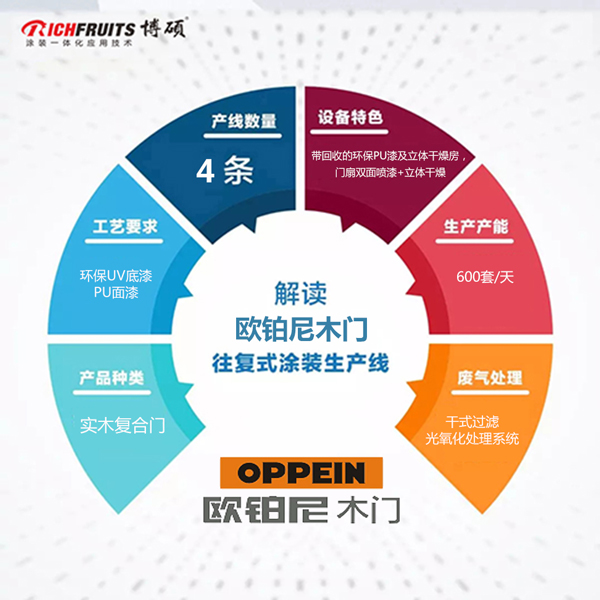 歐鉑尼木門運(yùn)用博碩實(shí)木復(fù)合門PU&WB自動(dòng)噴涂+立體干燥生產(chǎn)線,配置兩臺(tái)噴漆機(jī)和一臺(tái)翻面機(jī),雙面一次性完成噴涂,能夠?qū)ν苛线M(jìn)行回收利用,可以噴涂PU\NC\WB。
