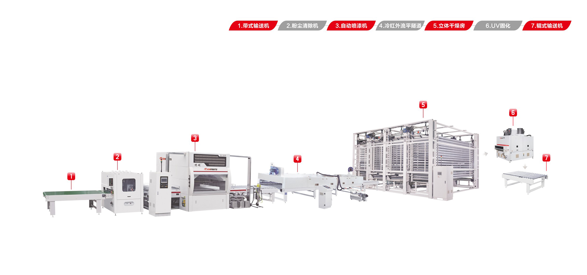 適用于板式家具、實(shí)木門、櫥柜門、工藝品、裝飾板、硅酸鈣板、玻鎂板、水泥纖維板的板式加工件的平面和四個(gè)側(cè)邊進(jìn)行高質(zhì)量、大批量連續(xù)噴漆。